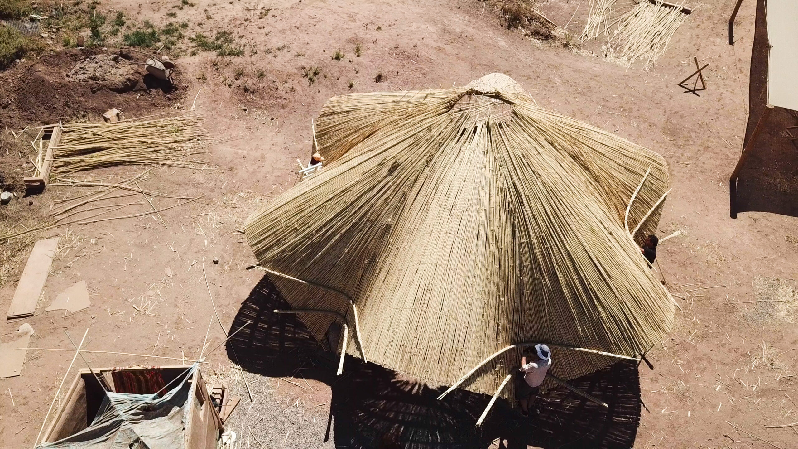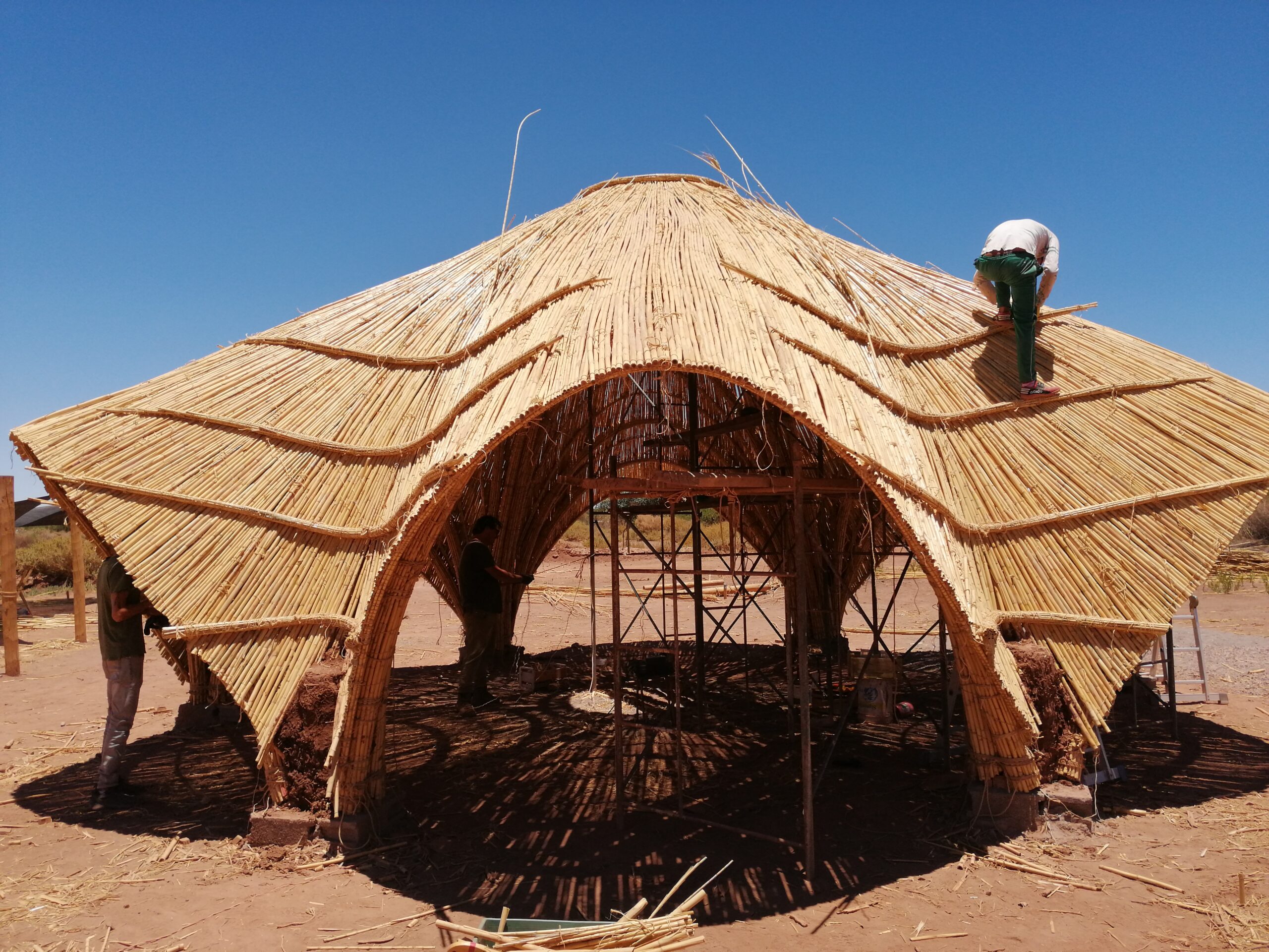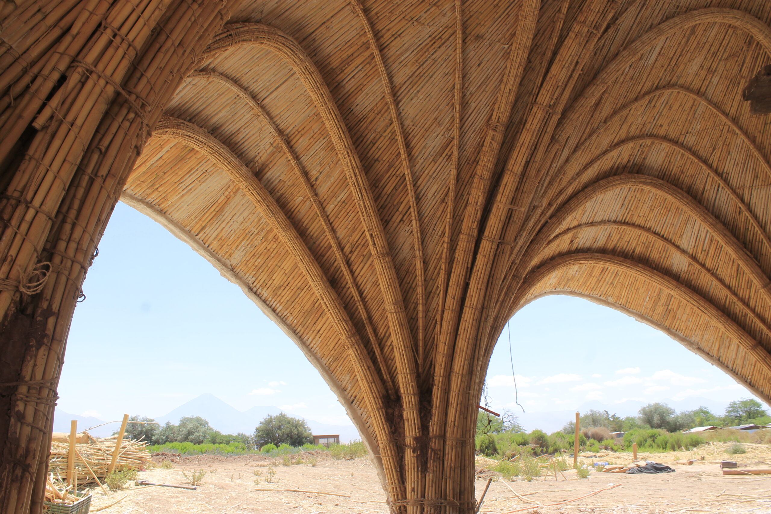 - Desarrollamos un proyecto de bioconstrucción con caña en San Pedro de Atacama, uno de los climas más extremos y áridos del planeta. Las estructuras se diseñaron para resistir fuertes contrastes térmicos y vientos intensos, aprovechando la flexibilidad y ligereza de la caña como material principal.