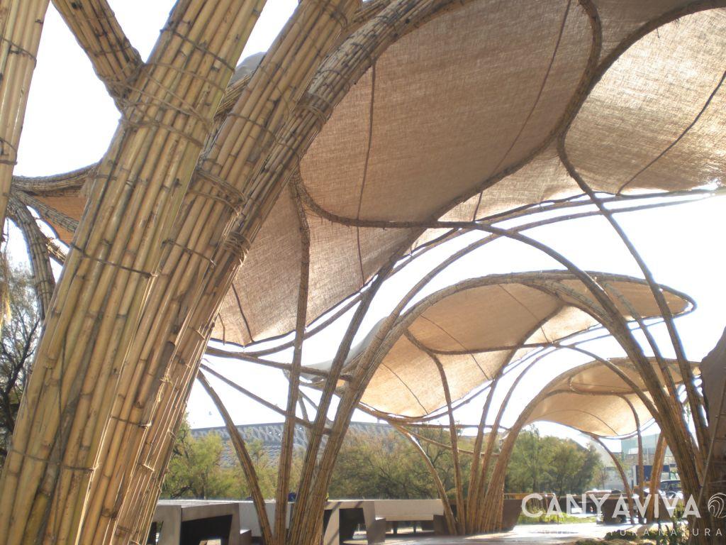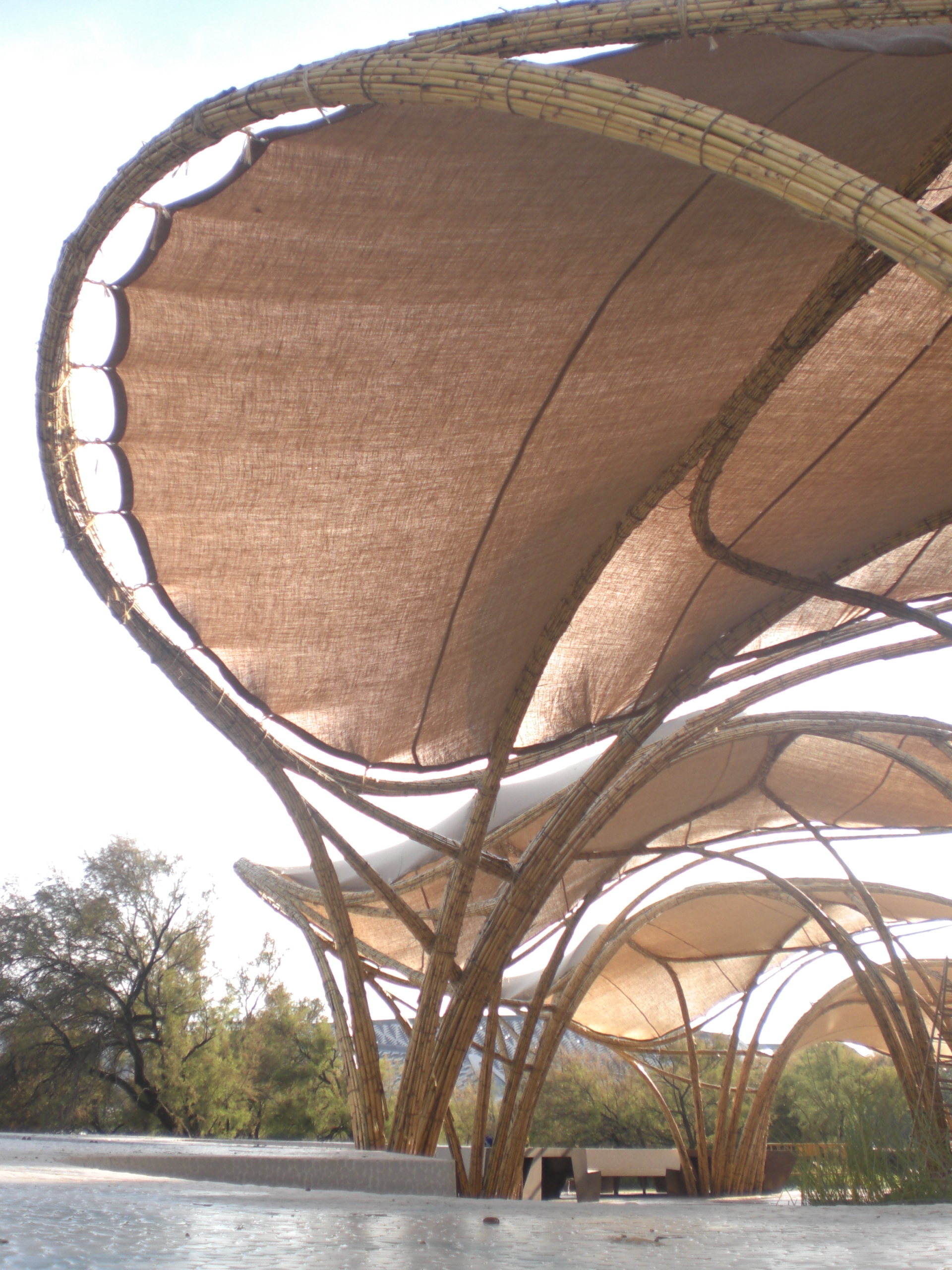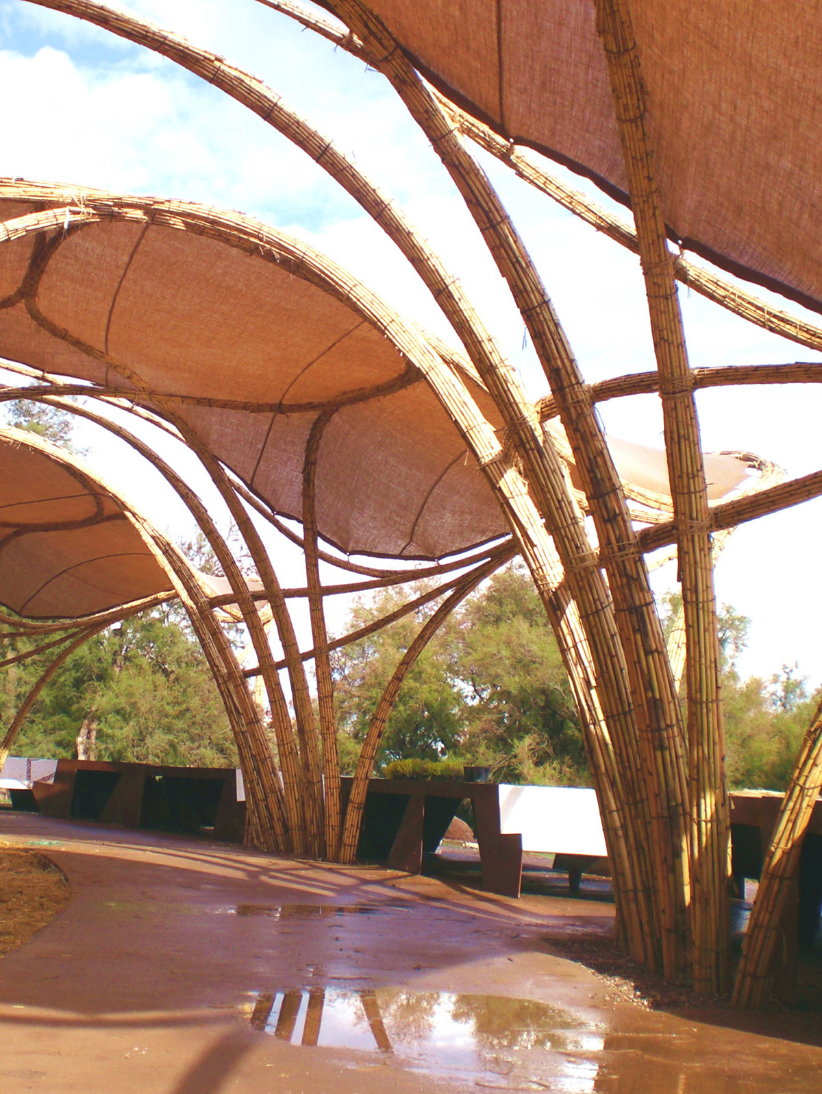 - Instalación pública para la Expo Zaragoza 2008, dedicada a la sostenibilidad y el uso racional del agua. Este fue el primer proyecto en el que desarrollamos arcos parabólicos prefabricados, transportados y montados en el lugar, abriendo el camino a nuevas posibilidades constructivas. La estructura de 250 m² de caña natural, cubierta con tela de yute para proporcionar sombra, ofrecía un espacio orgánico y acogedor que conectaba arquitectura, recursos naturales y conciencia medioambiental.