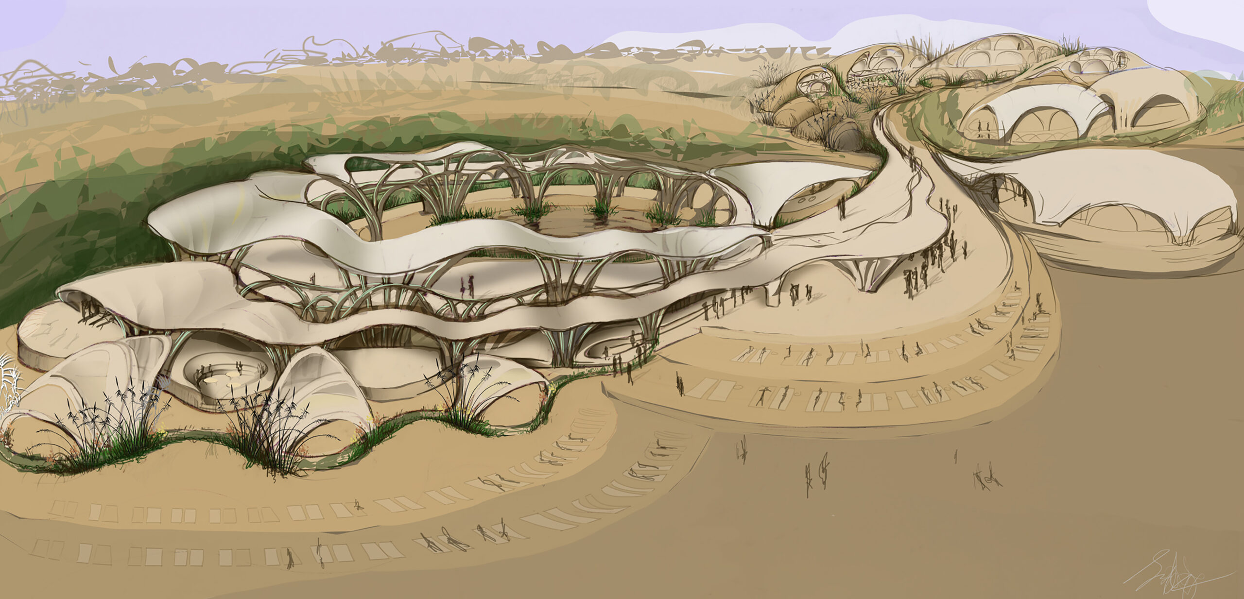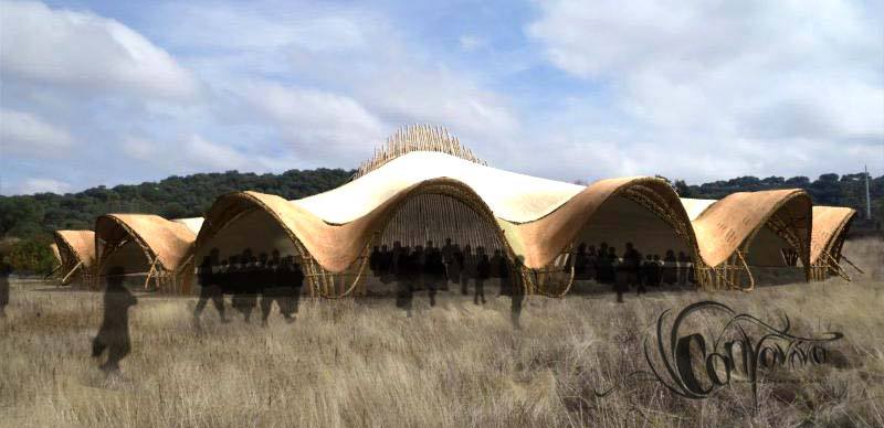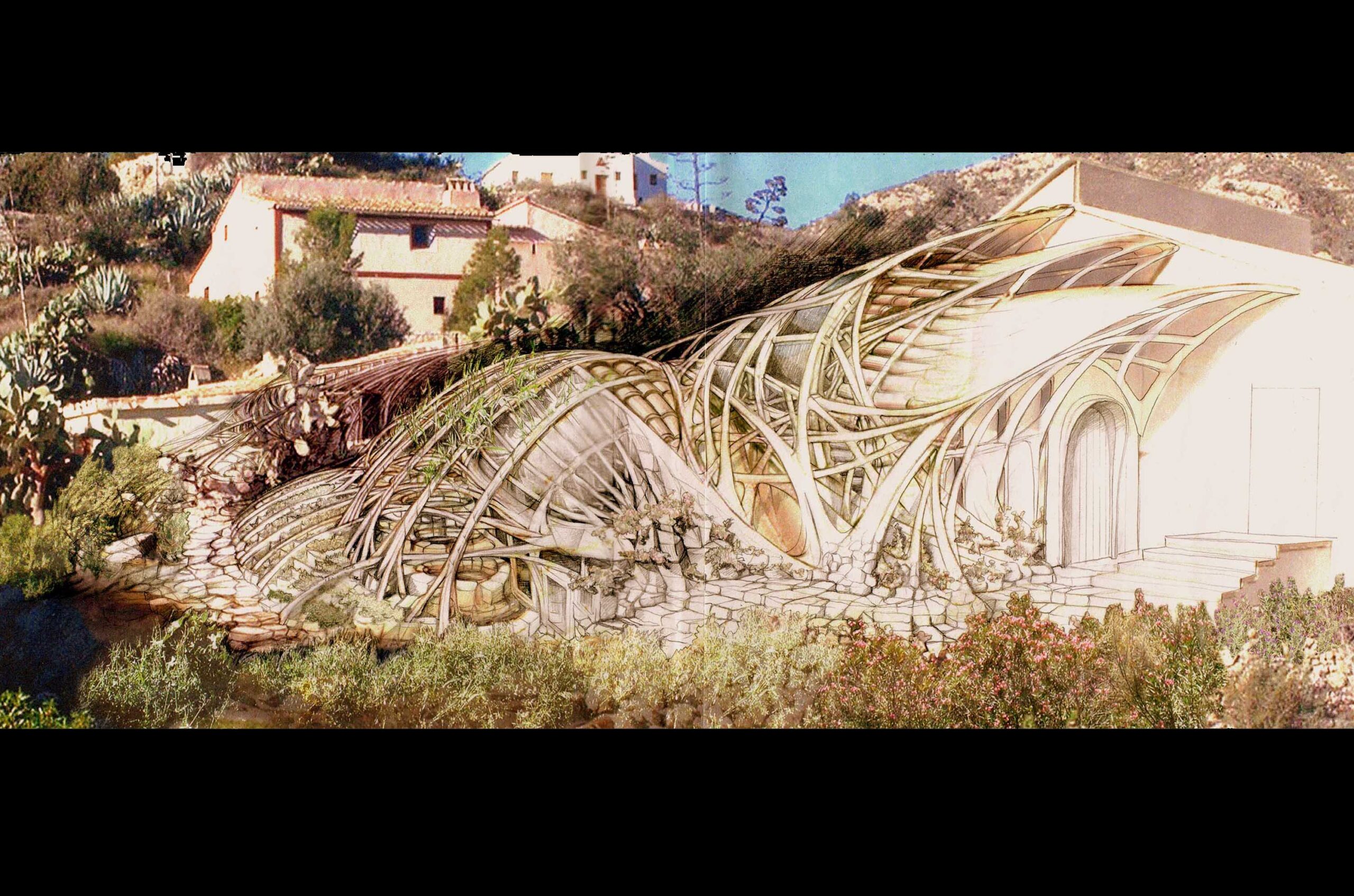 Primer diseño conceptual de una estructura permanente de caña, realizado en el paisaje desértico de Almería. Inspirado en la obra de H.R. Giger, este experimento exploraba las posibilidades escultóricas y arquitectónicas de la caña como material estructural principal. Cubierta con yeso o cal, la forma resultante evocaba una estética futurista y casi alienígena, anticipando muchas de las ideas que luego definirían el método CanyaViva.