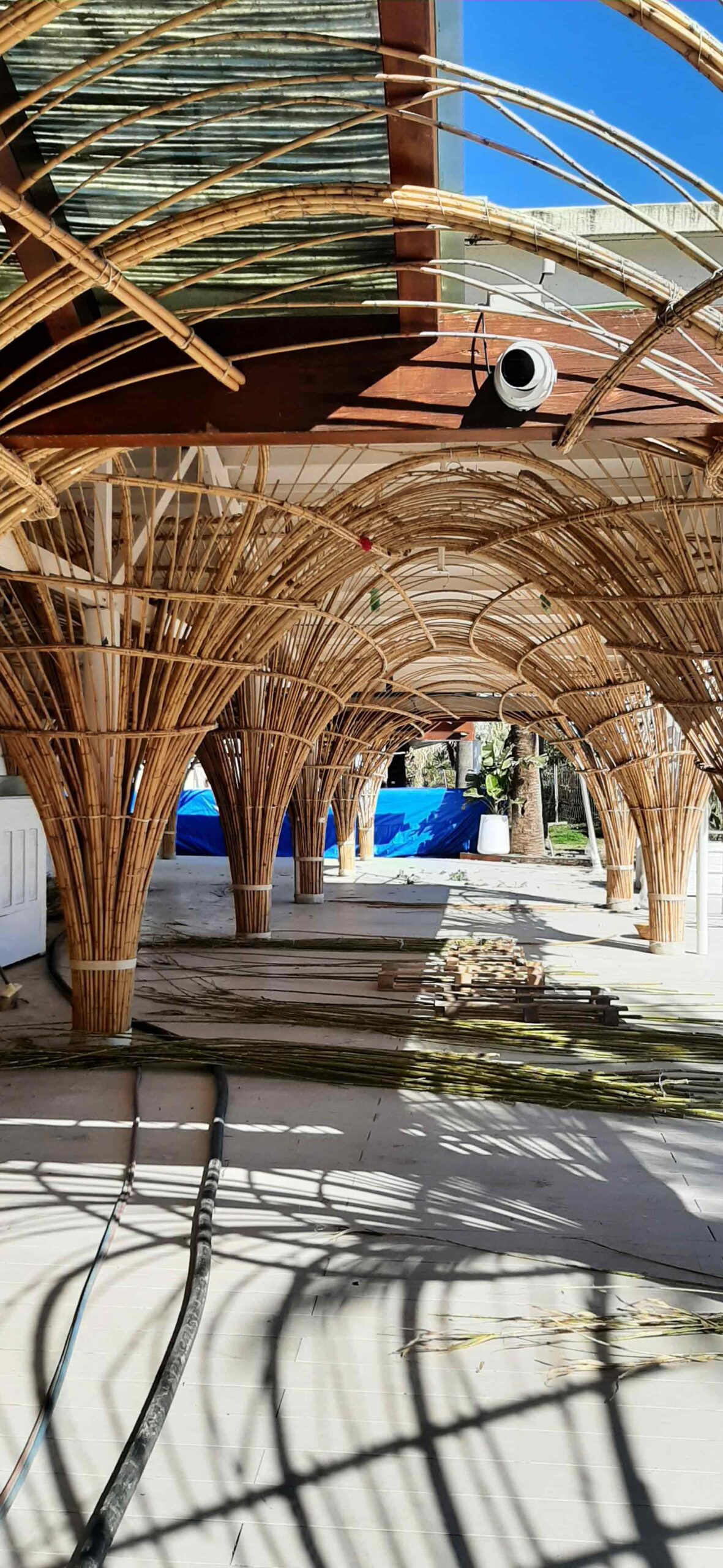 Esta instalación de gran escala combina caña mediterránea (Arundo donax) con artesanía tradicional y diseño estructural contemporáneo. El resultado es una cubierta arquitectónica ligera y a la vez altamente resistente, que proporciona sombra natural, una fuerte identidad visual y una estética orgánica distintiva, perfectamente alineada con el entorno costero de Ibiza.